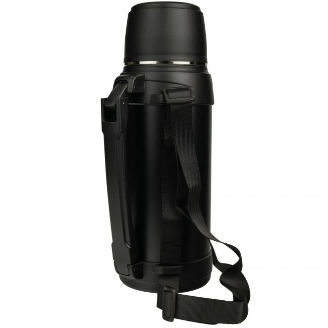 Термос снаружи покрыт порошковой краской, что обеспечивает максимальную защиту корпуса от царапин. Внизу и вверху термос обрамлен пластиковыми ободками. Прочная ручка позволяет удобно переносить термос в руке, а дополнительный ремень позволяет переносить термос на плечи.