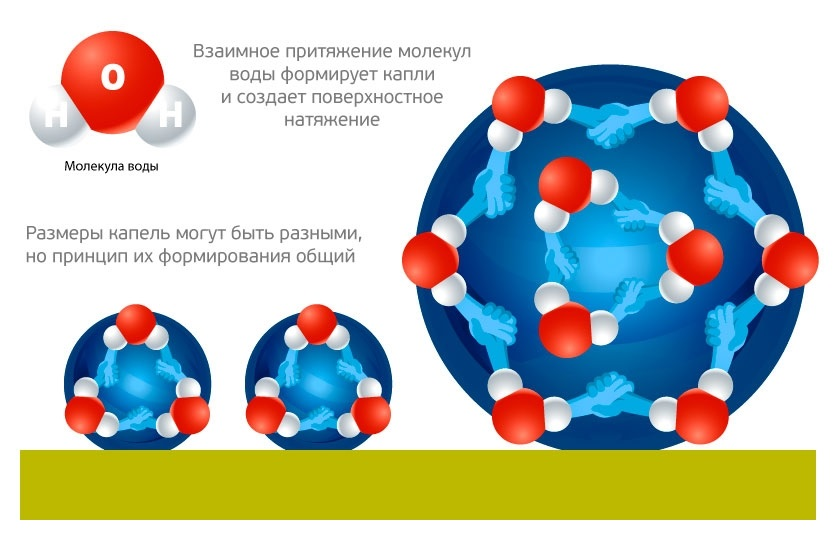 Щоб зрозуміти, як працює просочення, необхідно згадати фізику. Вода утворює краплі, які формуються завдяки взаємному тяжіння молекул. Ми бачимо стіну дощу, дрібний конденсат на віконному склі, росу на траві рано вранці, і все це при найближчому розгляді скупчення водяних крапель. Їх розмір може різниться, але обійти закони фізики неможливо: великі краплі під впливом зовнішніх сил розбиваються на більш дрібні, зберігаючи свою форму завдяки поверхневому натягу.