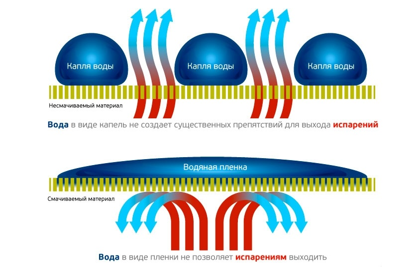 Незалежно від розміру краплі, вона не може проникнути крізь мембрану. Отвори в мембранній сітці настільки малі, що в силу фізичних причин, водна молекула не пройде через нього, на відміну від молекули пари, яка дрібніше і легко проникає через "сито". Чим більше краплі, що утворюються на водовідштовхувальній тканини, тим більша її площа звільняється від водної плівки, зменшується змочування, а отже ефективність паровідведення підвищується. По суті, краплі води, що стікають з поверхні штормової куртки або тенту намету, безпосередньо говорять про успішну роботу водовідштовхувального шару.