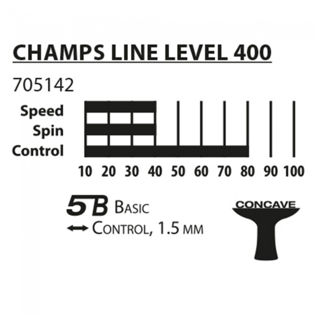 У комплект входять дві ракетки Champs 400 з гладкими накладками (шипами всередину), схваленими ITTF. Під накладкою знаходиться губка товщиною 1,5 мм, яка надає ракетці гарного прискорення, але водночас достатній контроль м'яча для впевненої гри. Ця ракетка має контроль м'яча явно на першому плані.